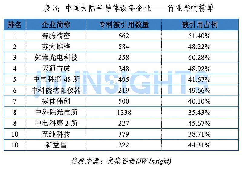 以专利被引用情况作为企业的技术对行业技术的贡献大小的参照。专利被引用的情况包括被其他专利文献公开引用,或在其他专利的实质审查程序中审查员将本专利文献作为对比文献在通知书或检索报告中引用。专利被引用数量的多少和专利被引用占比的高低可以反映出企业披露的专利对应的技术方案的研究热度和业内关注活跃度,侧面反映出企业专利的技术先进性和对行业的贡献程度。爱集微知识产权基于各企业被引用专利数量和被引用专利占比的合理权重,生成行业影响力得分,并发布中国大陆半导体设备领域企业专利行业影响榜单TOP10。